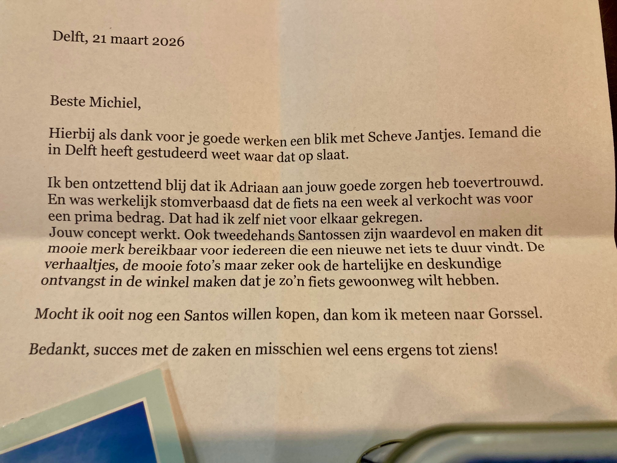 Hij staat nu bij Saint Christopher gefascineerd naar een andere Santos Travel Lite te kijken. Een zwarte met brede banden, gevulde tassen en al 45.000 km ruige kilometers in de tandwielen en tandriem. In de praktijk bewezen theorie. Het kán, denkt Adriaan. Ik wÃl.