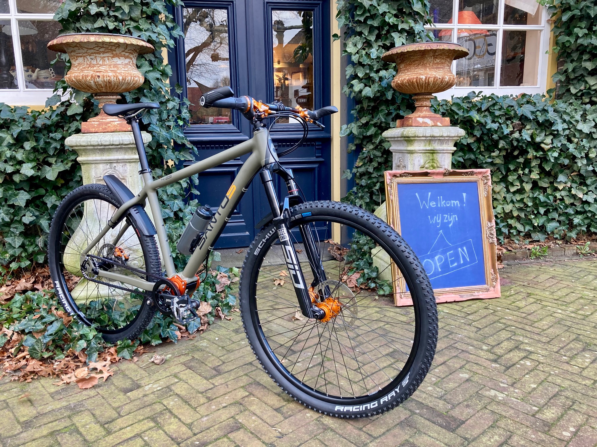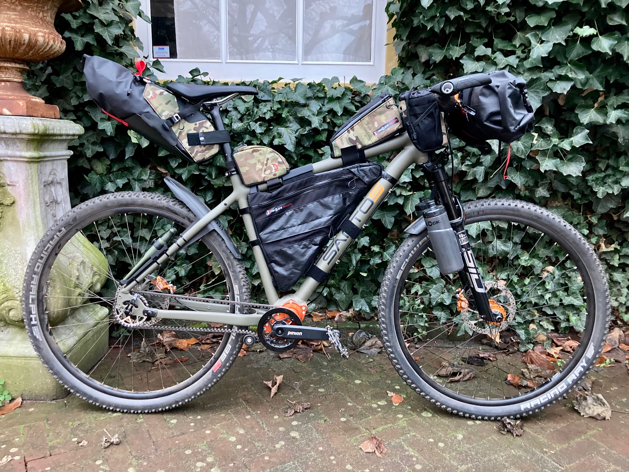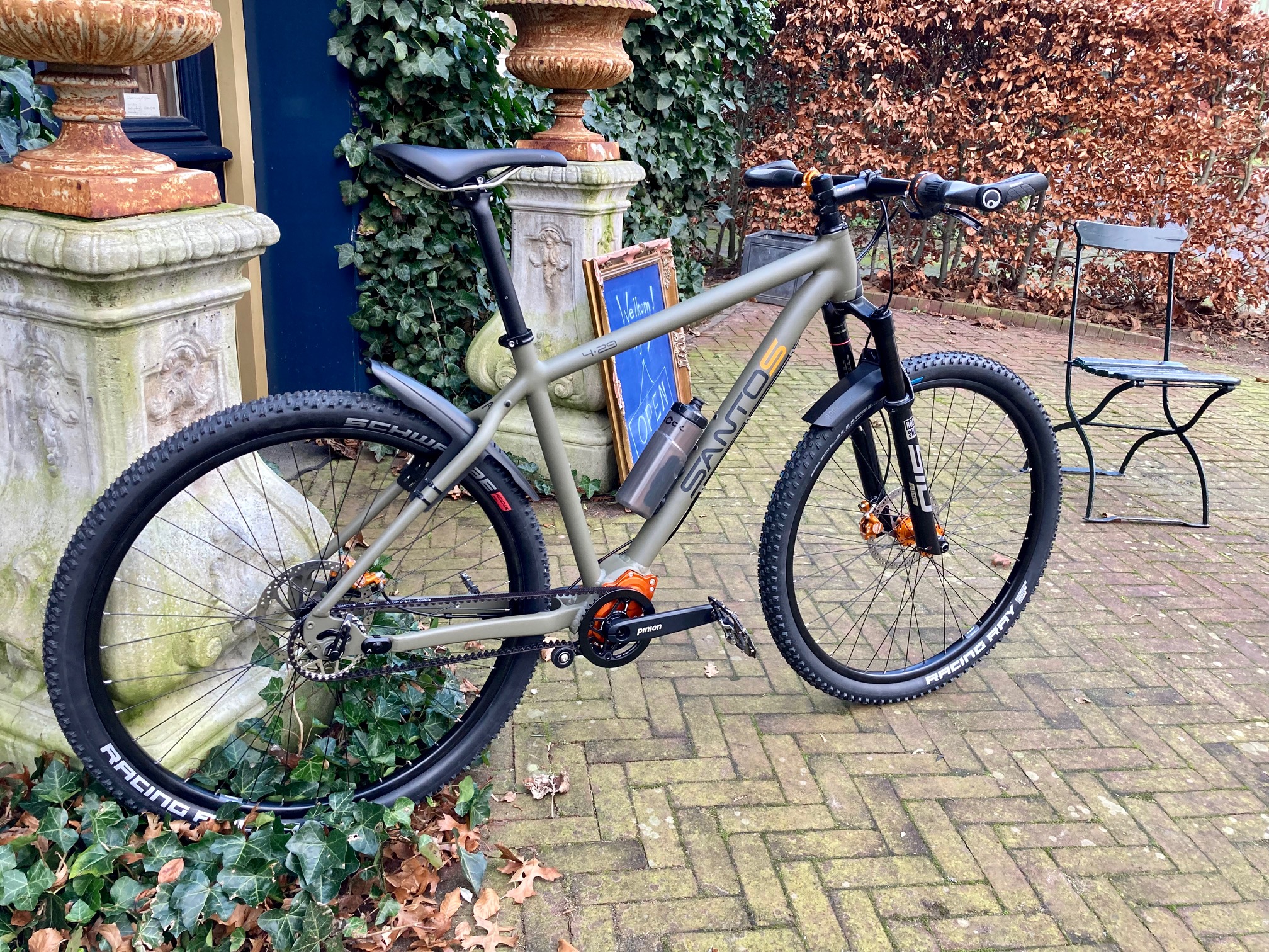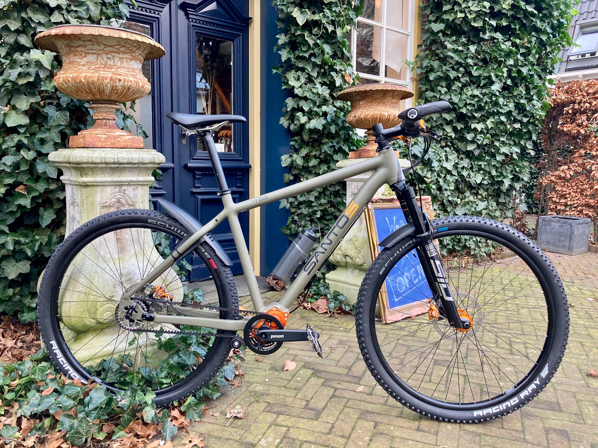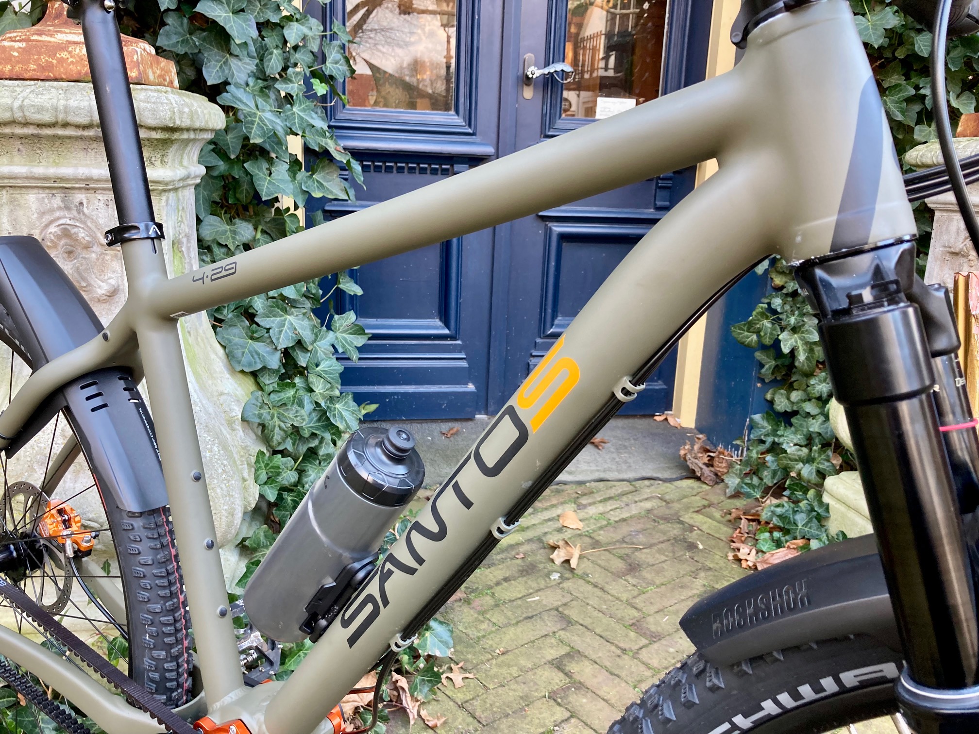 Franciscus is een Santos Adventure Lite met een olijfgroen frame. “Raw Earth” noemt Santos het. De kleur van het bos in november, van korstmos op een steen, van iemand die niet wil opvallen. Aards, maar toch ook met een beetje frivoliteit in de vorm van oranje details.