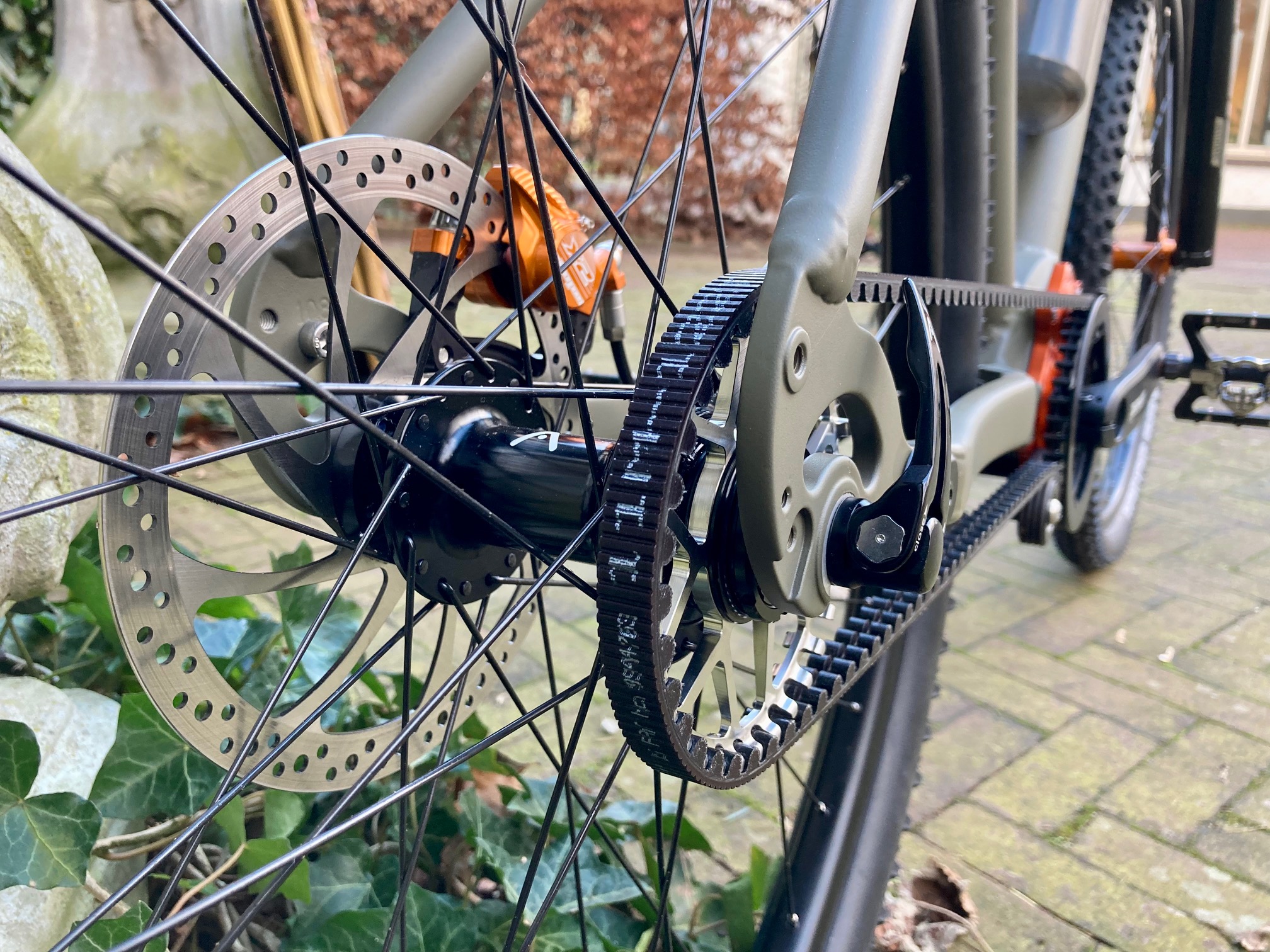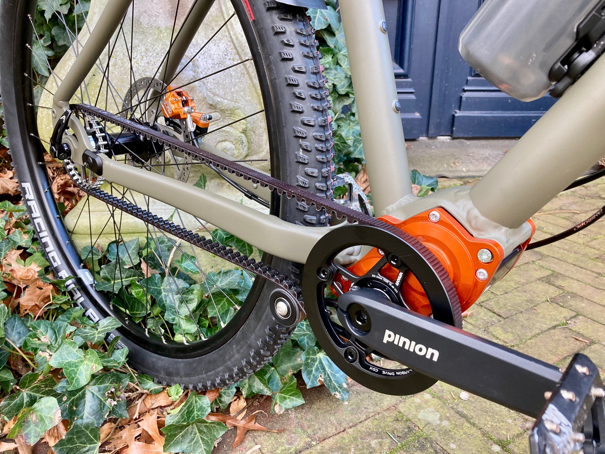 Pinion versnellingsbak: volledig gesloten, geen olie in het bos, ongevoelig voor de omstandigheden. Een tandriem die geen smering vraagt en niet klaagt over zand. Banden die modder kennen maar geen sporen achterlaten die er niet mogen zijn.