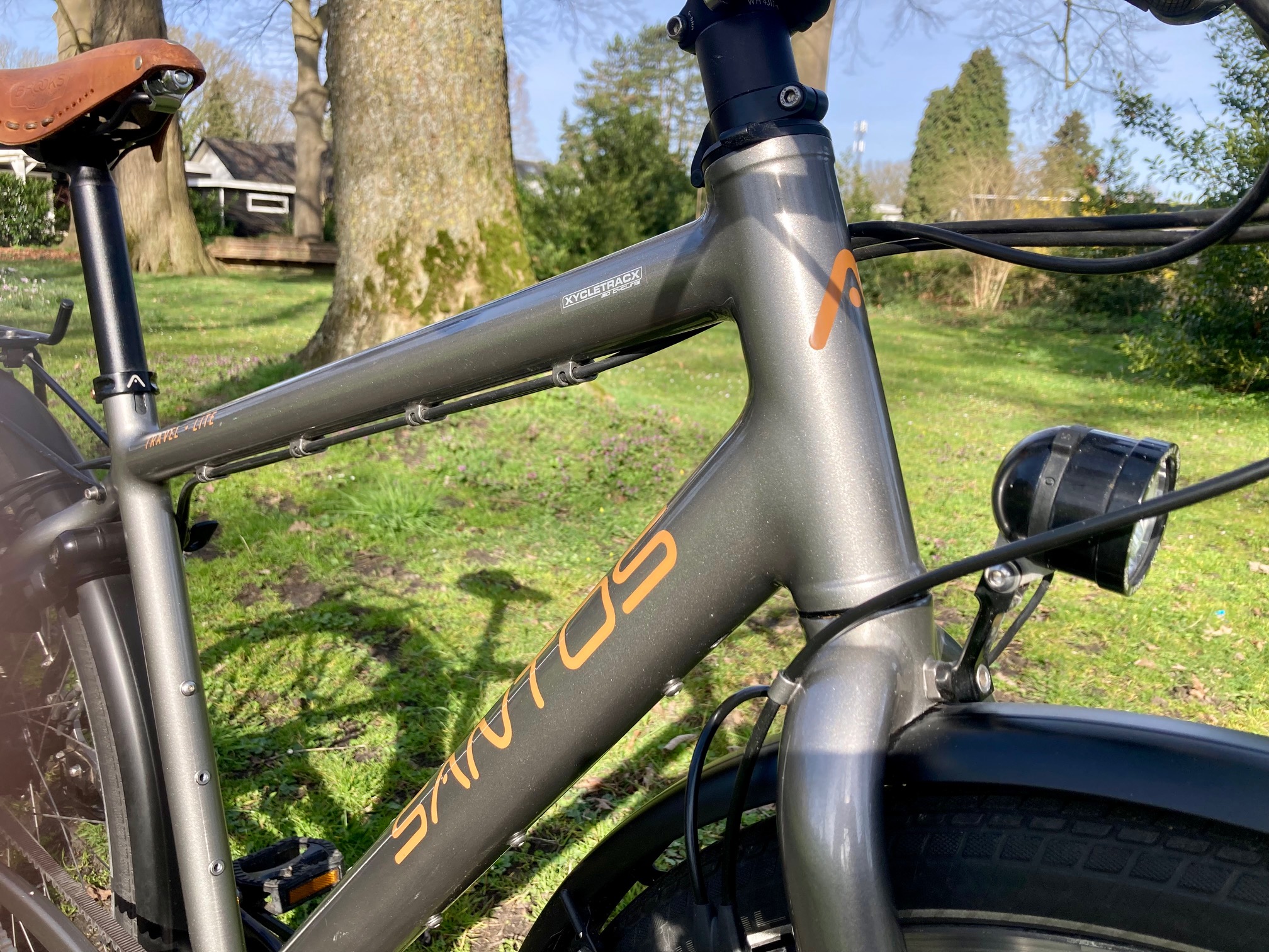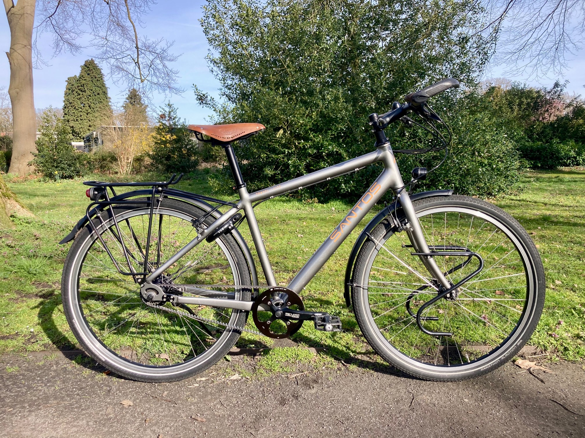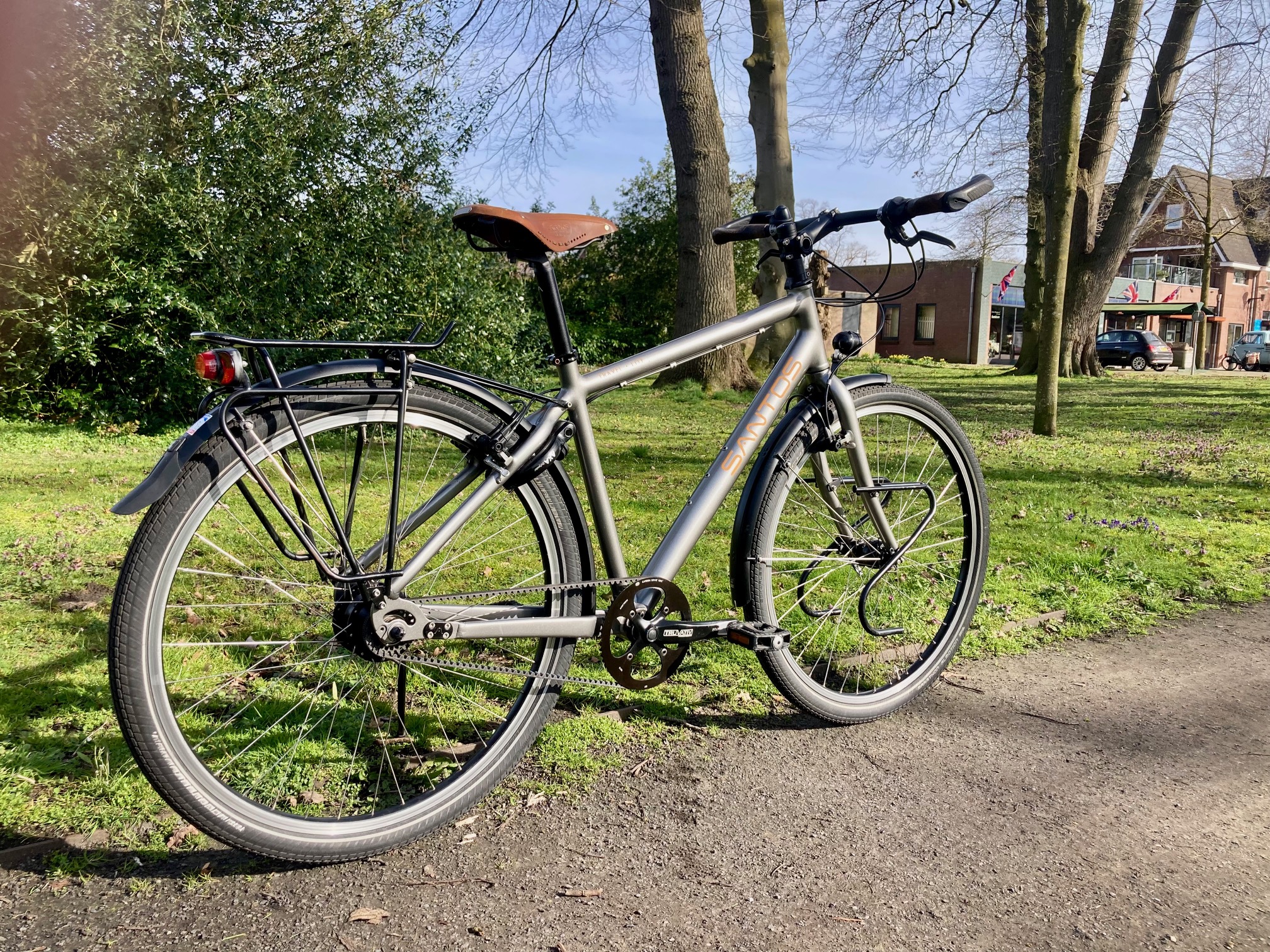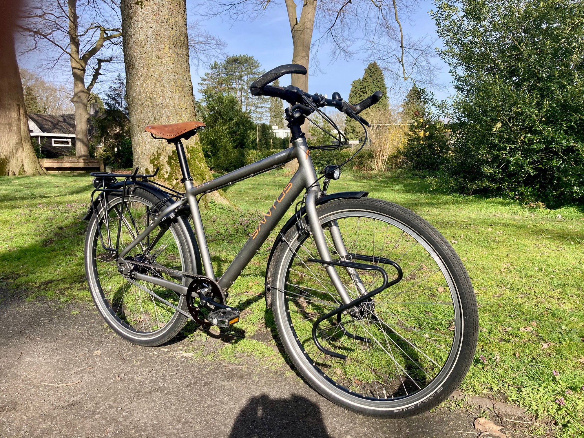 Rohloff-naaf, tandriem, Magura Firmtech remmen, SON naafdynamo. Gesloten systemen. Minimale slijtage, minimaal onderhoud. Een Santos heeft een relatief hoge aanschafwaarde, maar na vele jaren nog een zeer hoge restwaarde. In tien jaar tijd slechts duizend euro afschrijving. De accountant heeft het uitgerekend: honderd euro per jaar en slechts een paar tientjes onderhoud. Goedkoper kan niet. Maarten wist het al die tijd al. Hij wachtte rustig tot zijn eigenaar hetzelfde inzag.